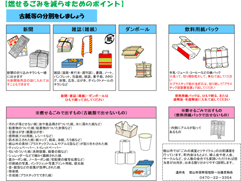 古紙類(新聞、雑誌、ダンボール)、飲料用紙パック