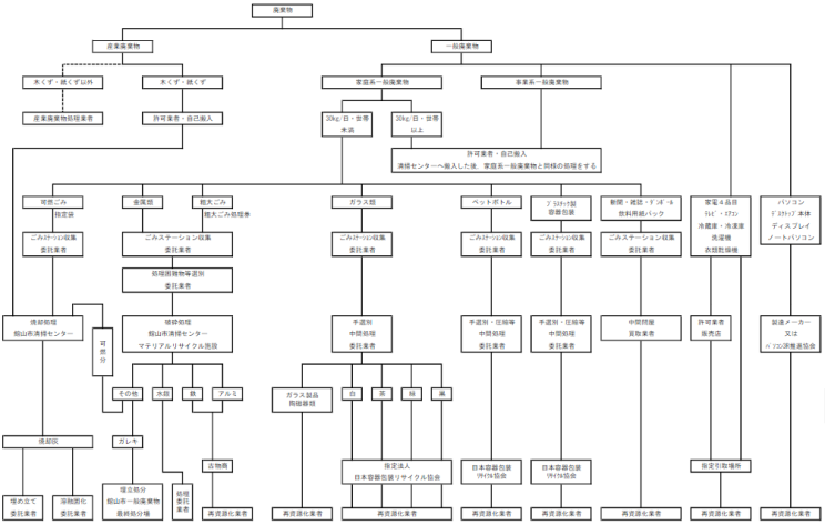 (1)燃せるごみ (2)粗大ごみ 金属類〔(3)金属製品など・(4)空き缶・(5)乾電池・(6)蛍光管、体温計(水銀使用)〕 ガラス類〔(7)空きびん・(8)ガラス製品、陶磁器類〕 (9)プラスチック製容器包装 (10)ペットボトル 古紙類〔(11)新聞・(12)雑誌(雑紙)・(13)ダンボール〕 (14)飲料用紙パック