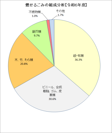 ■ ごみ組成分析の結果から、「紙・布類」と「ビニール、合成樹脂、ゴム、皮革類」が、多くの割合を占めていることがわかります。