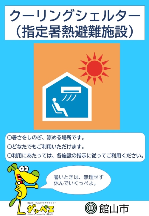 熱中症による健康被害を防止することを目的として、一時的に暑熱から避難するために市が指定している施設のことです。「熱中症特別警戒情報(通称:熱中症特別警戒アラート)」が発表されたときに、暑さをしのげる場所として一般に開放されます。