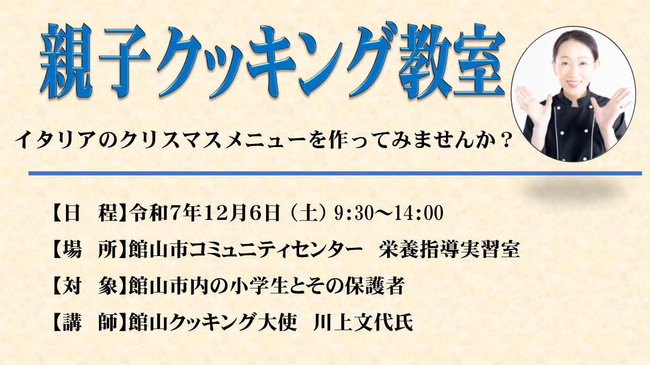 館山市中央公民館では、デリス・ド・キュイエール川上文代料理教室主宰、料理研究家として活躍している、館山クッキング大使の川上文代さんを講師に迎えて「親子クッキング教室」を開催します。