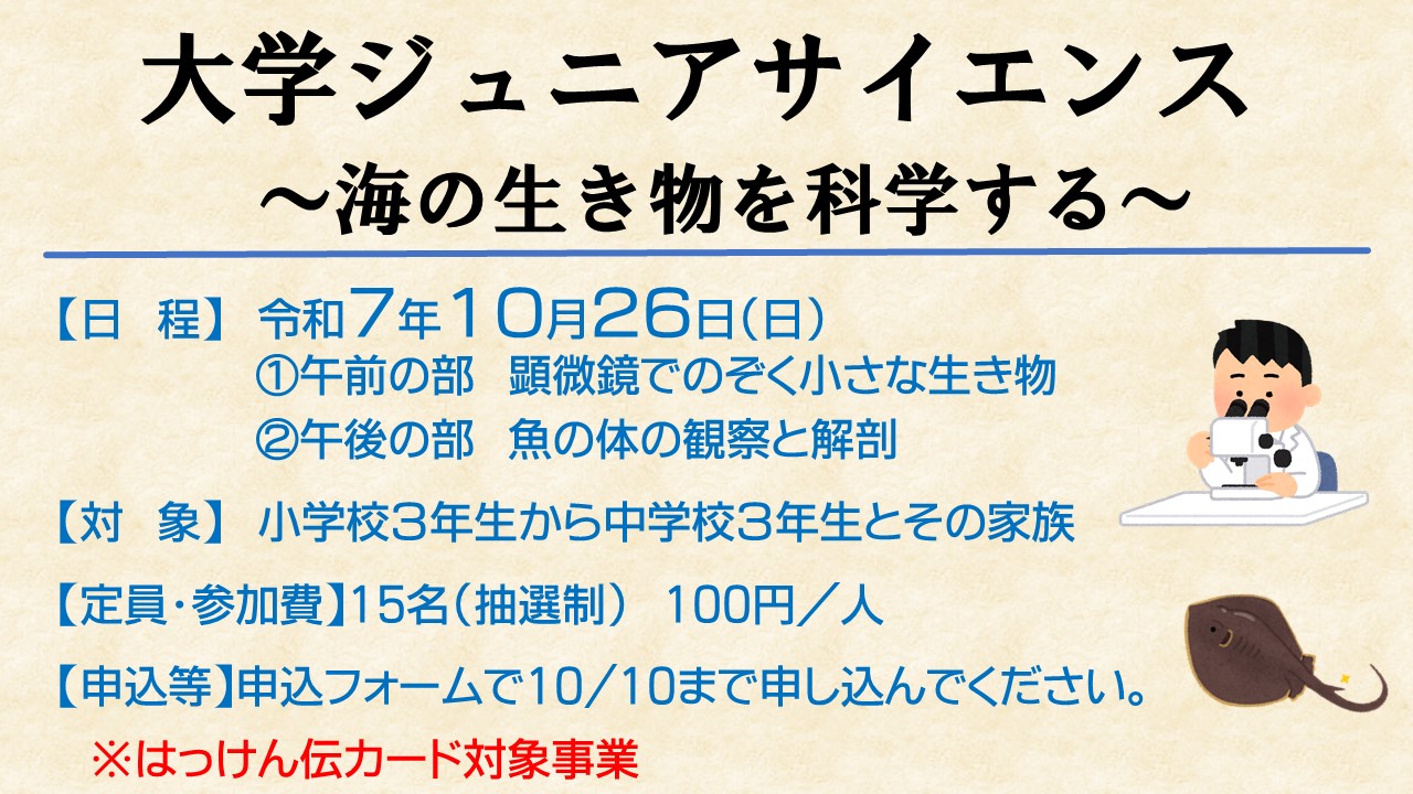 館山市中央公民館では、お茶の水女子大学と共催で、海の生き物についての実験観察を行います。