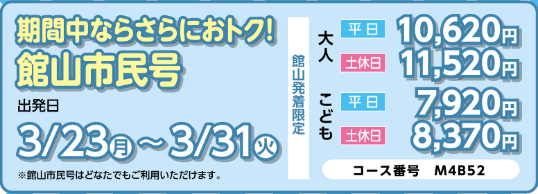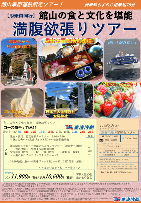 東京(竹芝)発着の館山往復乗船券+館山・南房総観光のセット商品です。