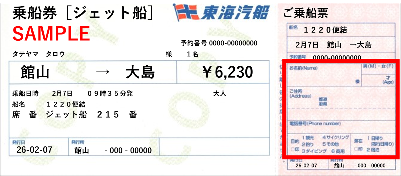 (2)乗船券右側の乗船票に必要事項を記入してください。