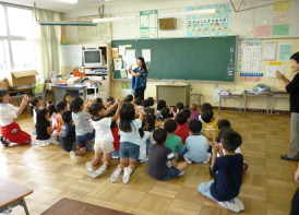 楽しい絵本の語りについ引き込まれて、 本の中の言葉を一緒に唱和しながら、