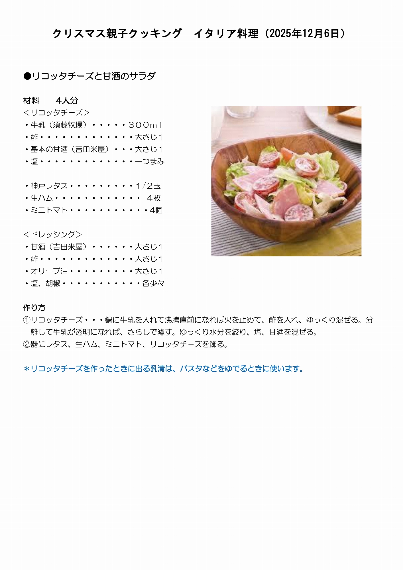 ●リコッタチーズと甘酒のサラダ〈吉田米屋の甘酒・須藤牧場の牛乳・かんべレタス〉
