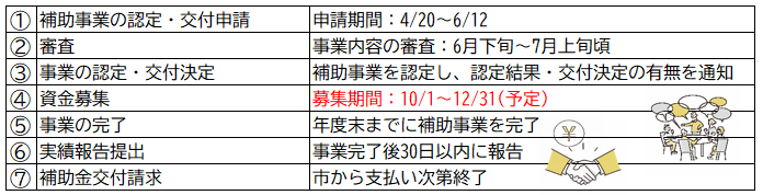 ※ 資金募集目標額を超える資金(寄附金)が集まった場合は、市の必要とされる事業に活用させていただきます。スケジュール