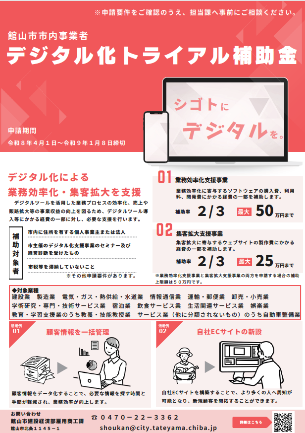 館山市では、デジタルツールを活用した業務プロセスの効率化、売上や販路拡大等の事業収益の改善を図るため、デジタル化に意欲的に取り組む者のデジタルツール導入等にかかる経費の一部に対し、必要な支援を行うことを目的として、予算の範囲内において『館山市市内事業者デジタル化トライアル補助金』を交付します。