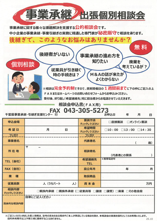事業承継 出張個別相談会とは、千葉県事業承継・引継ぎ支援センター主催の事業承継に関する様々な課題解決を支援する公的相談会です。
