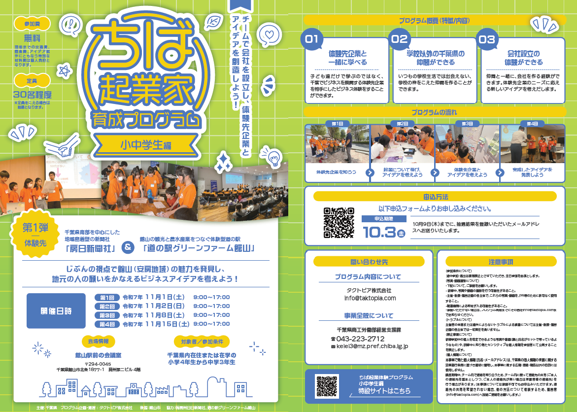 自分の視点で館山(安房地区)の魅力を発見し、館山(安房地区)の人の願いがかなえられるビジネスアイデアを考える「ちば起業家育成プログラム(小中学生編)」を開催します。