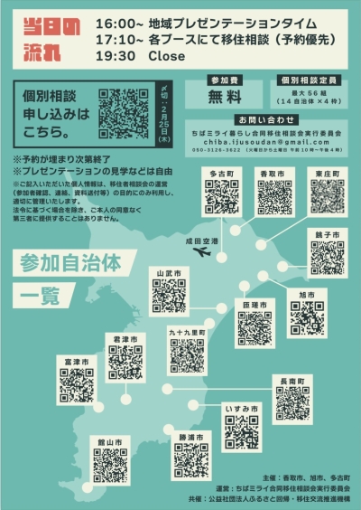 当日は、県内14の市町(館山市、香取市、銚子市、旭市、勝浦市、君津市、富津市、匝瑳市、山武市、いすみ市、多古町、東庄町、九十九里町、長南町)が参加し、住まいや仕事、子育て環境、生活環境などについて、各自治体の担当者に直接相談(予約優先)することができます。ぜひお気軽にご参加ください!