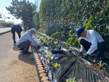 11月15日(土)晴天の中、那古地区コミュニティ委員会(会長:小柴 昇)が、福原有信グラウンド館山(市営市民運動場)前の花壇で、カレンデュラ苗の移植作業を行いました。 この事業は、教育委員会スポーツ課と那古地区コミュニティ委員会とで年2回、共同で実施している事業です。 植栽の苗・肥料・マルチなどはスポーツ課が提供し、移植作業は那古地区コミュニティ委員会が実施しています。 作業は、肥料撒き・マルチシート張り・苗の移植・水撒きの順で作業を行い、無事にカレンデュラの移植を終えました。