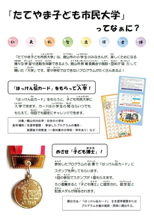 「たてやま子ども市民大学」とは、館山市の小学生の皆さんが、楽しく、ためになる様々な学習や活動を体験できるよう、館山市教育委員会や施設・団体が協力して開いた「大学」です。